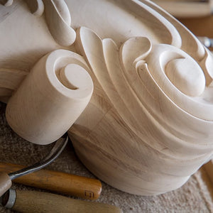 For curvy, tight-fit detail like this, sandpaper is too stiff, too hard on the edges. A soft flexible cloth or felted stick pushing around a loose fine pumice grit—a sharp-edged foamed glass stone dust—is the best way to put a silky smooth finish on tightly shaped details in wood and plaster castings.